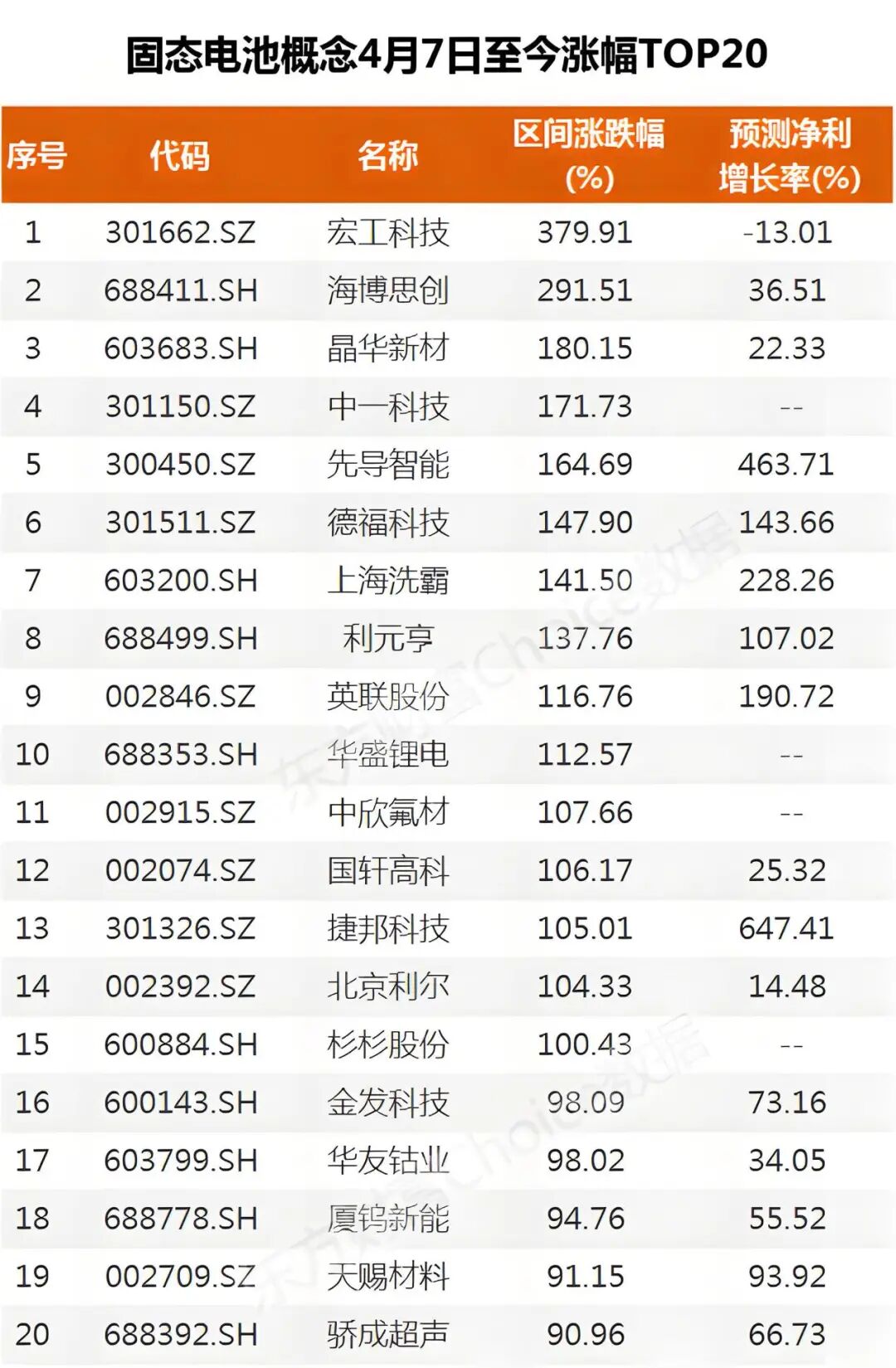 排名第一的是宏工科技,4月7日至今涨幅超370%,据高工锂电,宏工科技作为混合纤维化设备龙头,已经供货国内头部固态电池企业。