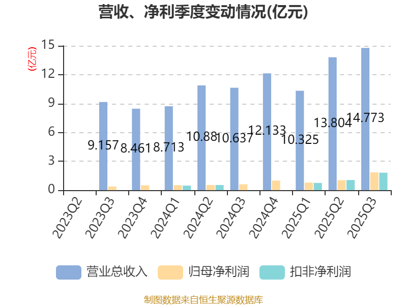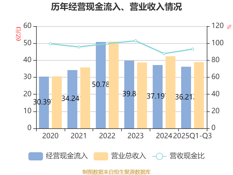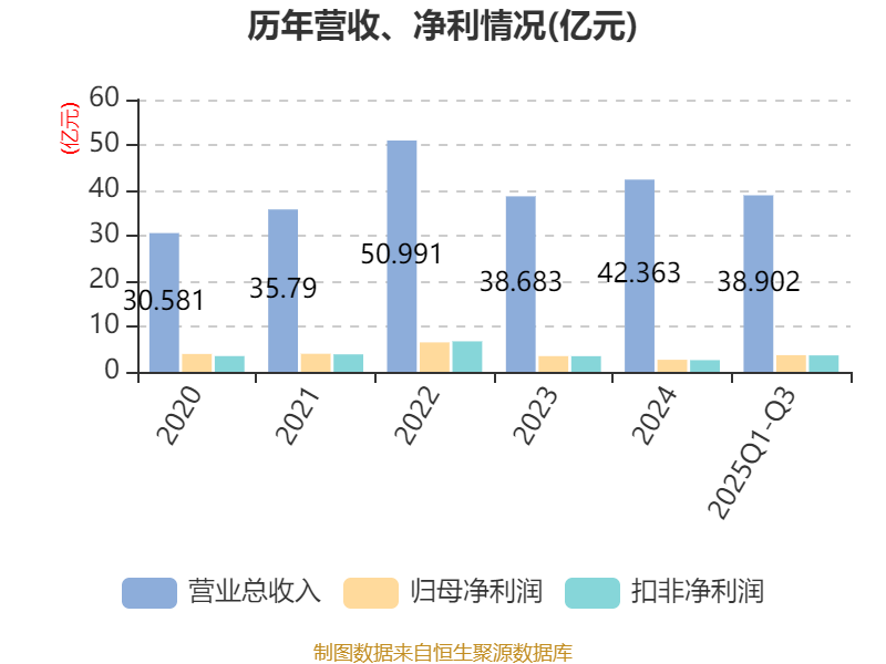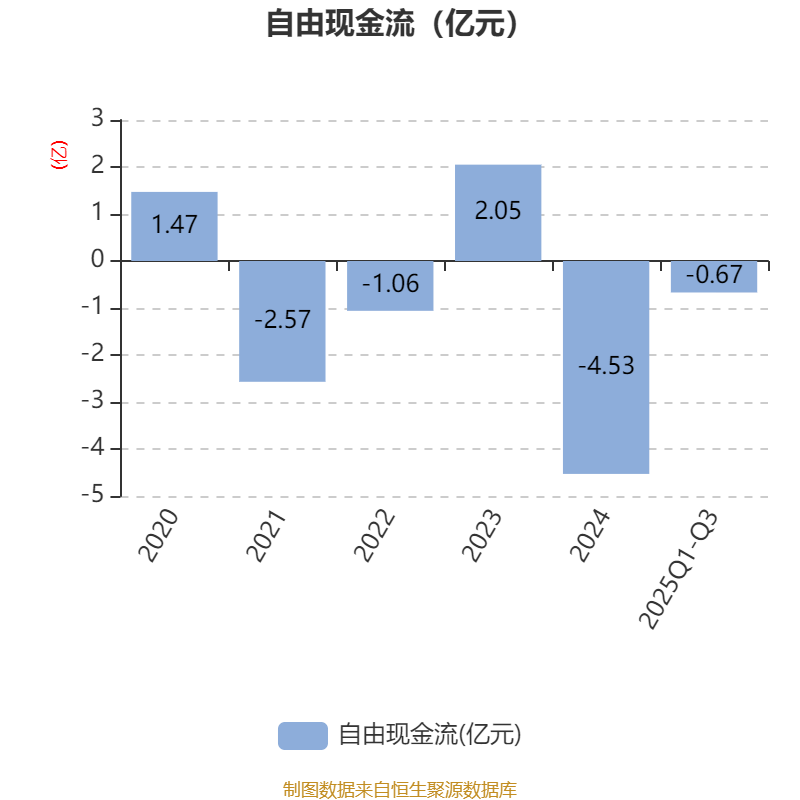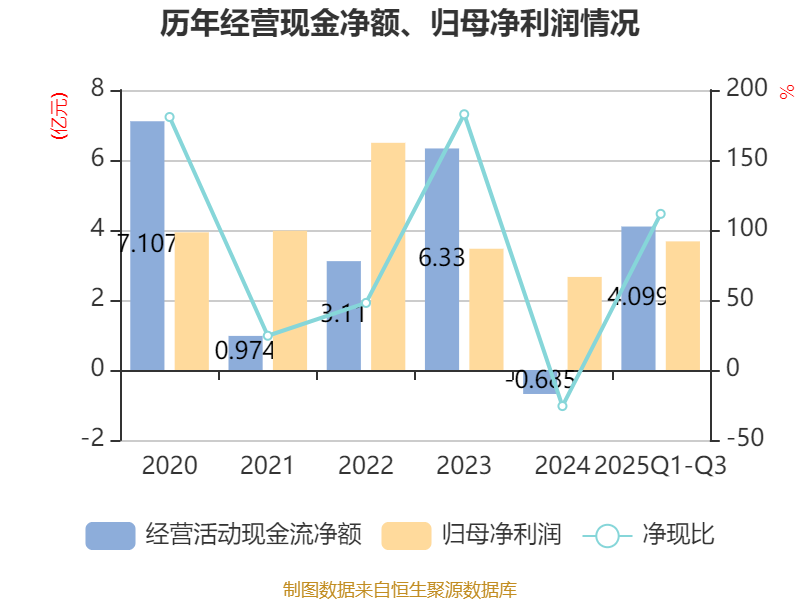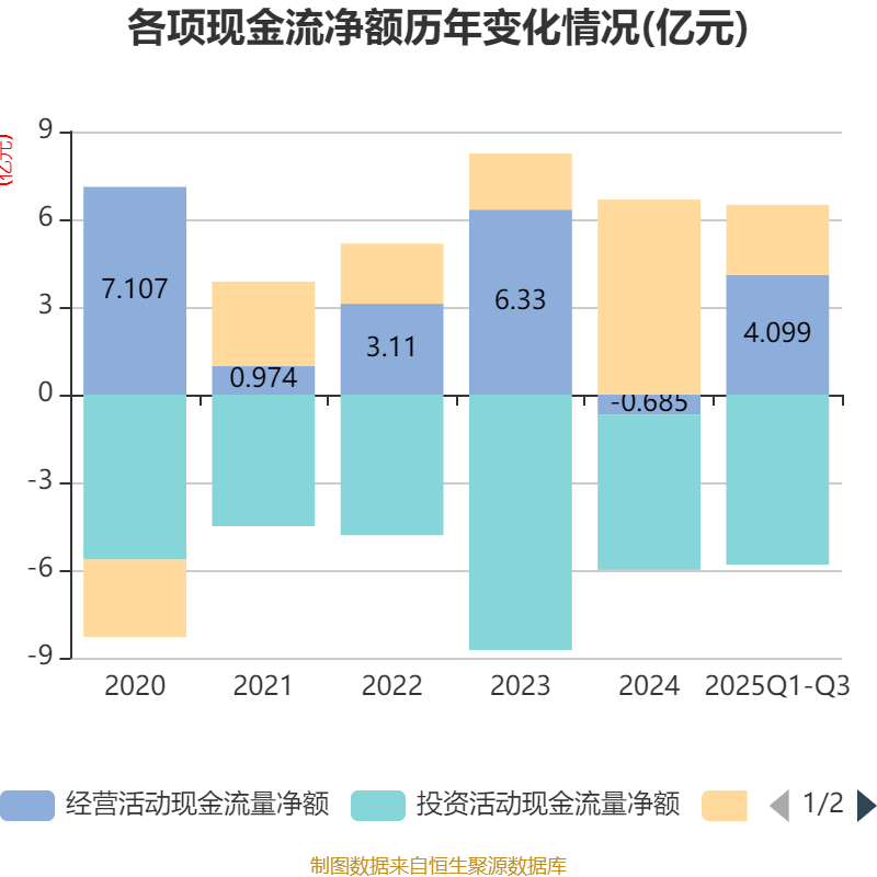 2025年前三季度,公司经营活动现金流净额为4.1亿元,同比增加6.08亿元;筹资活动现金流净额2.4亿元,同比减少3.31亿元;投资活动现金流净额-5.81亿元,上年同期为-3.69亿元。