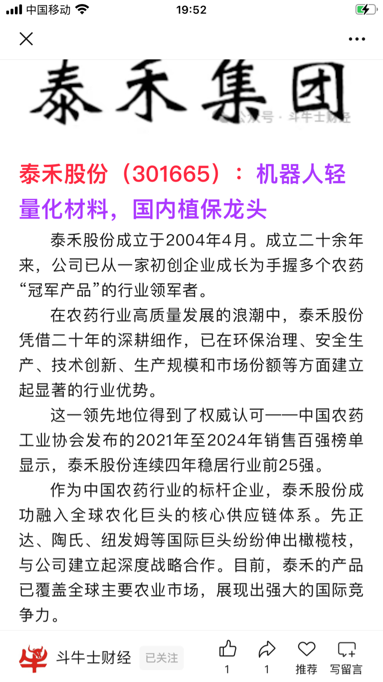 看周末的消息周一定会高开高走,东大是农业大国,也是农业强国的名号再也不是喊喊口号了,东大的跨国农药公司真正诞生了,期待伟大