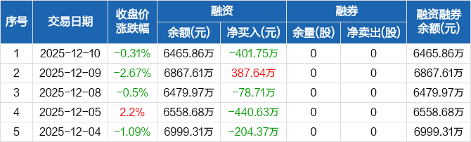 泰禾股份:融资净偿还401.75万元,融资余额6465.86万元(12-10)