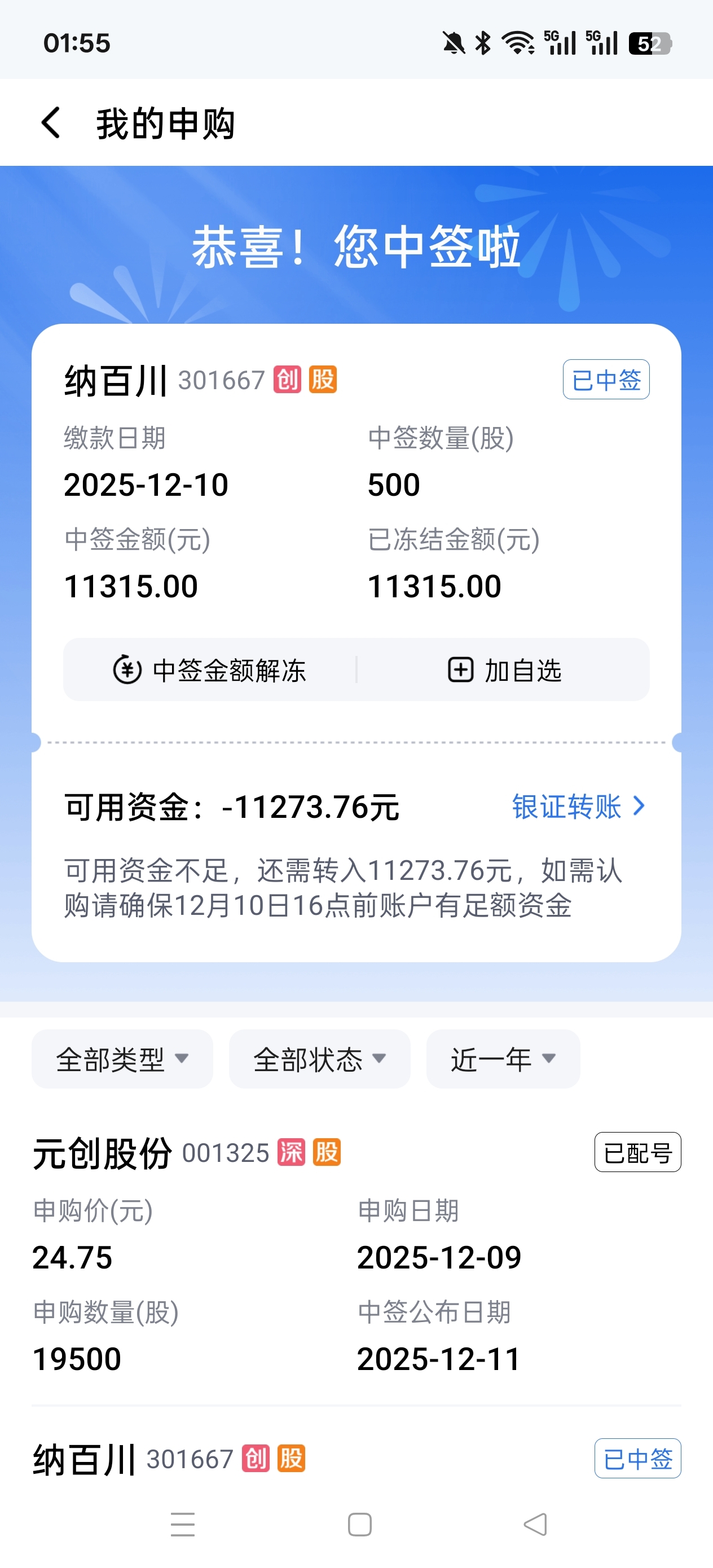 $纳百川(SZ301667)$ 今年第二次中签。
