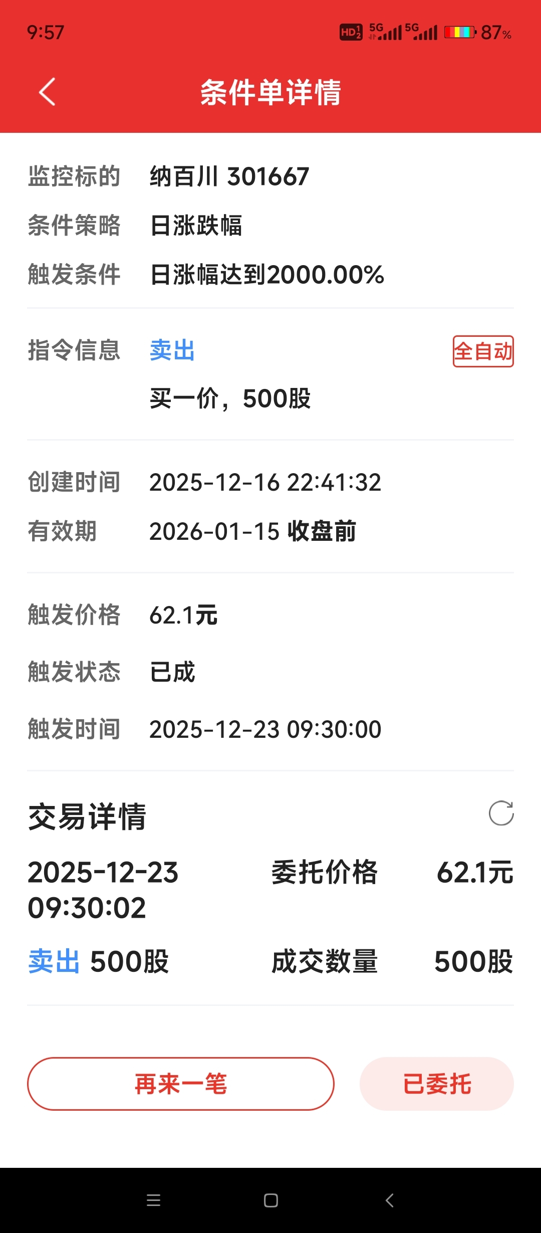 $N纳百川(SZ301667)$ 早上设置了一个条件单,没想到新股上市条件单不能超过102%,超过就失效了,自动触发卖出,开盘就以62.10元成交了!哈哈,不是我的财,还想十倍呢!结果不到2倍就卖出了,等会儿跌到我的卖出价再买回来