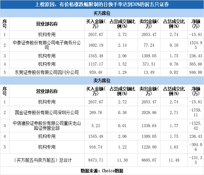 深交所2026年1月5日交易公开信息显示,纳百川因属于有价格涨跌幅限制的日换手率达到30%的前五只证券而登上龙虎榜。纳百川当日报收73.58元,涨跌幅为-8.31%,换手率44.81%,振幅4.97%,成交额7.50亿元。