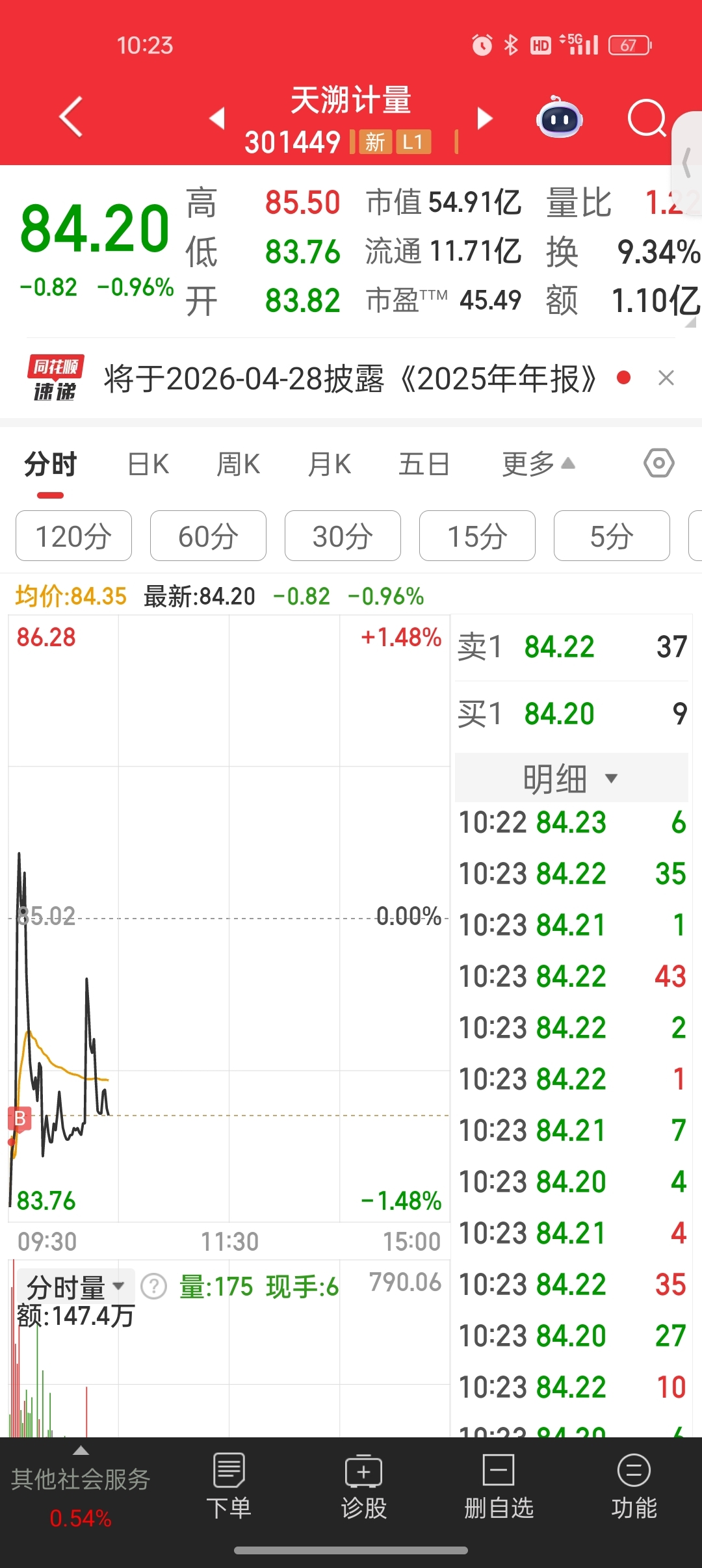 $纳百川(SZ301667)$ 昨晚挂跌停清仓东方通信,开盘后买入天朔,看着有些闲散银两再接回东方,管住手不追纳百川。鄙人不才,全仓买入,杠杆拉满,成本84.098,仓位100%,今日基操已完成晒图如下