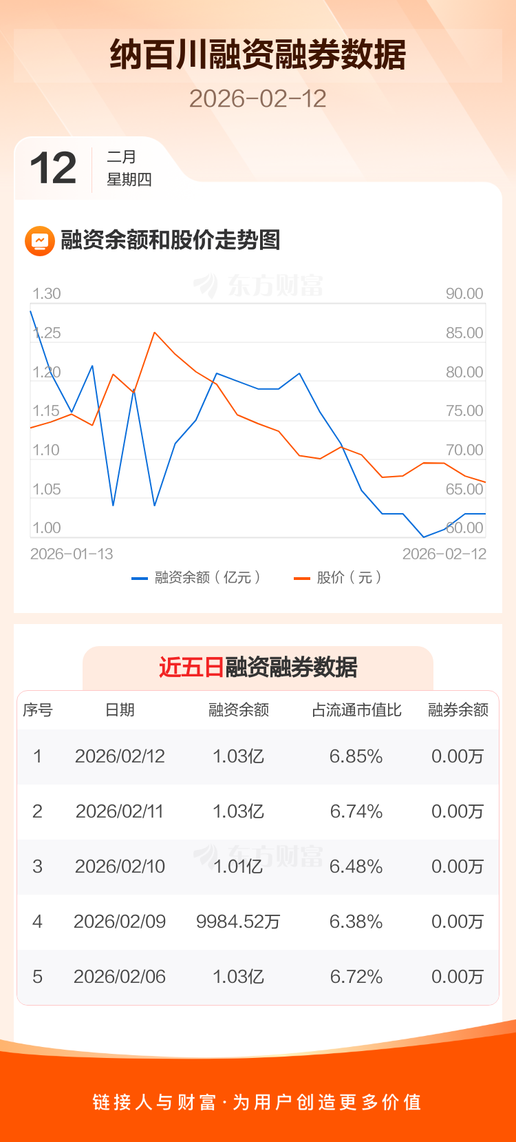 交易所最新数据显示,纳百川于2026年2月12日获融资买入587.57万元,融资偿还552.02万元,当日融资净买入35.55万元。目前,该股融资余额1.03亿,占流通市值比例为6.85%。