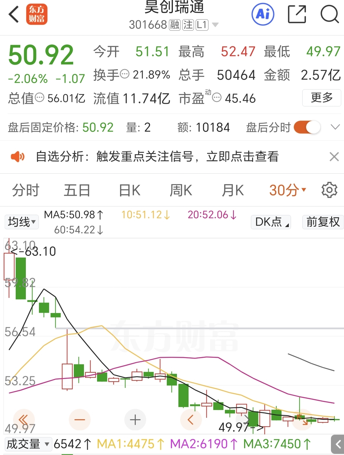 $昊创瑞通(SZ301668)$ 什么时候上面那条线往上翘,放量大阳,再买也不迟,现在买进去就是炮灰