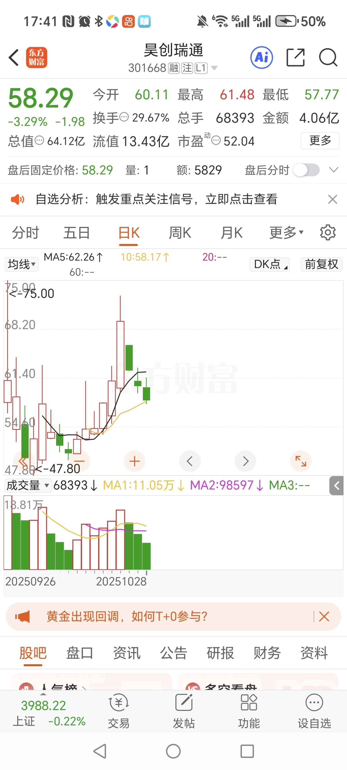$昊创瑞通(SZ301668)$ 虽然我也亏了4个点但是缩量三天,而且今天10日线也没有破呀,10日线附近还是有承接,也没有那么恐怖呀,明天开盘30分钟内不放量上攻分时线的上方的话果断放弃。只能认亏