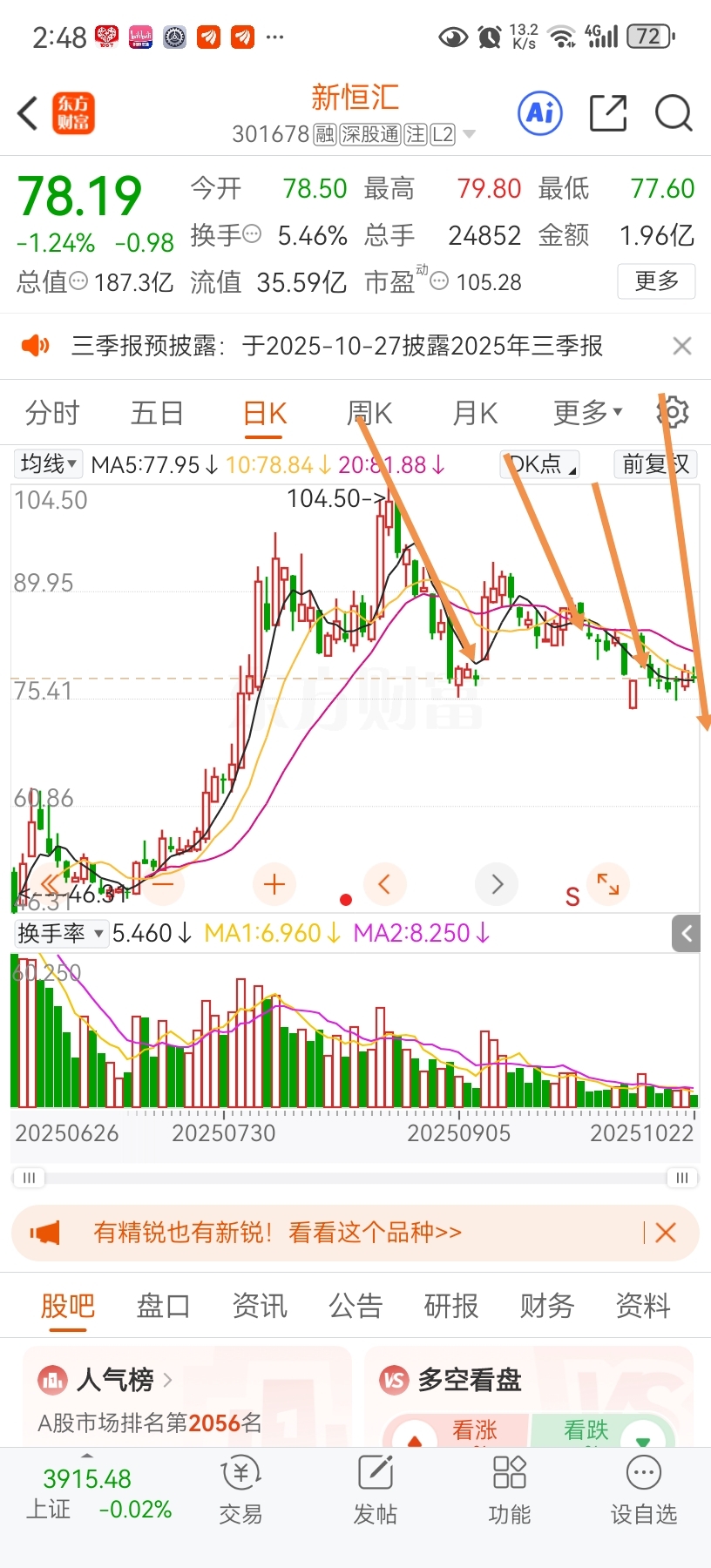 $新恒汇(SZ301678)$ 你是要跌到50吗?