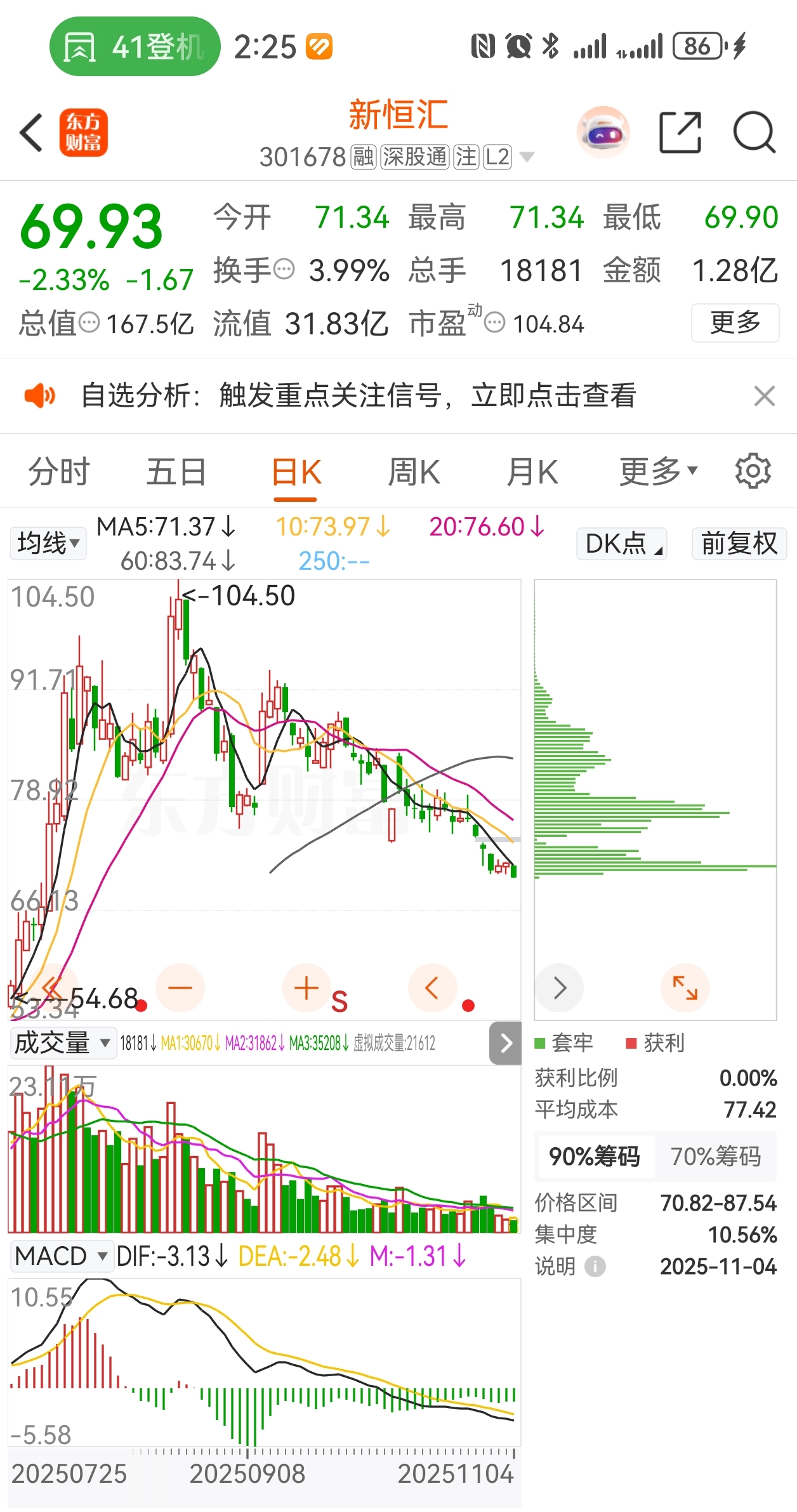 $新恒汇(SZ301678)$ 获利比例:00.00%,这回安静了。