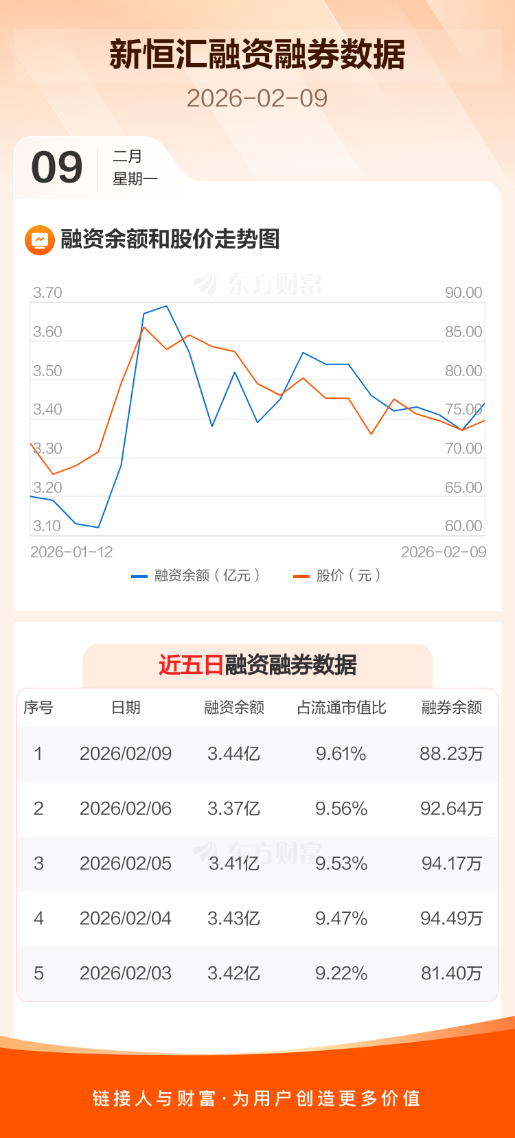 交易所最新数据显示,新恒汇于2026年2月9日获融资买入1823.05万元,融资偿还1058.99万元,当日融资净买入764.06万元。目前,该股融资余额3.44亿,占流通市值比例为9.61%。