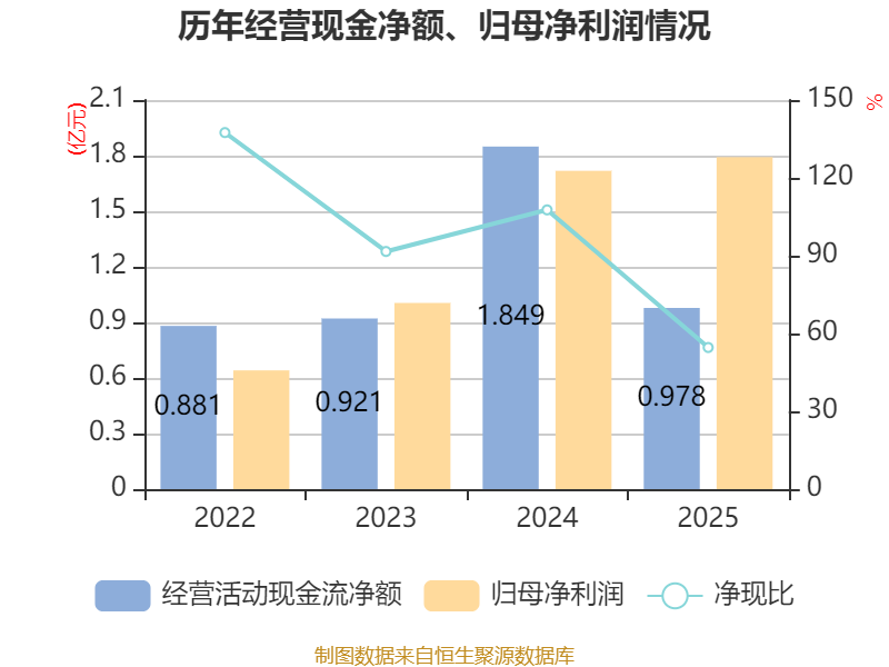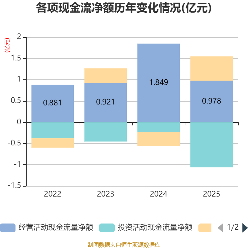 截至2025年,公司经营活动现金流净额为9782.45万元,同比下降47.1%;筹资活动现金流净额5697.4万元,同比增加8950.01万元;投资活动现金流净额-1.06亿元,上年同期为-2347.87万元。