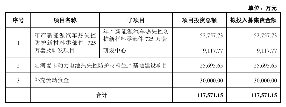 招股书显示,公司本次发行募集资金拟投向年产新能源汽车热失控防护新材料零部件725万套及研发项目、陆河麦卡动力电池热失控防护材料生产基地建设项目和补充流动资金。