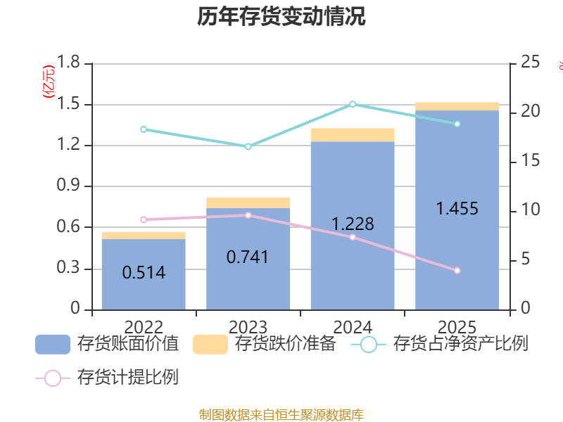 从存货变动来看,截至2025年末,公司存货账面价值为1.45亿元,占净资产的18.84%,较上年末增加2267.58万元。其中,存货跌价准备为598.48万元,计提比例为3.95%。