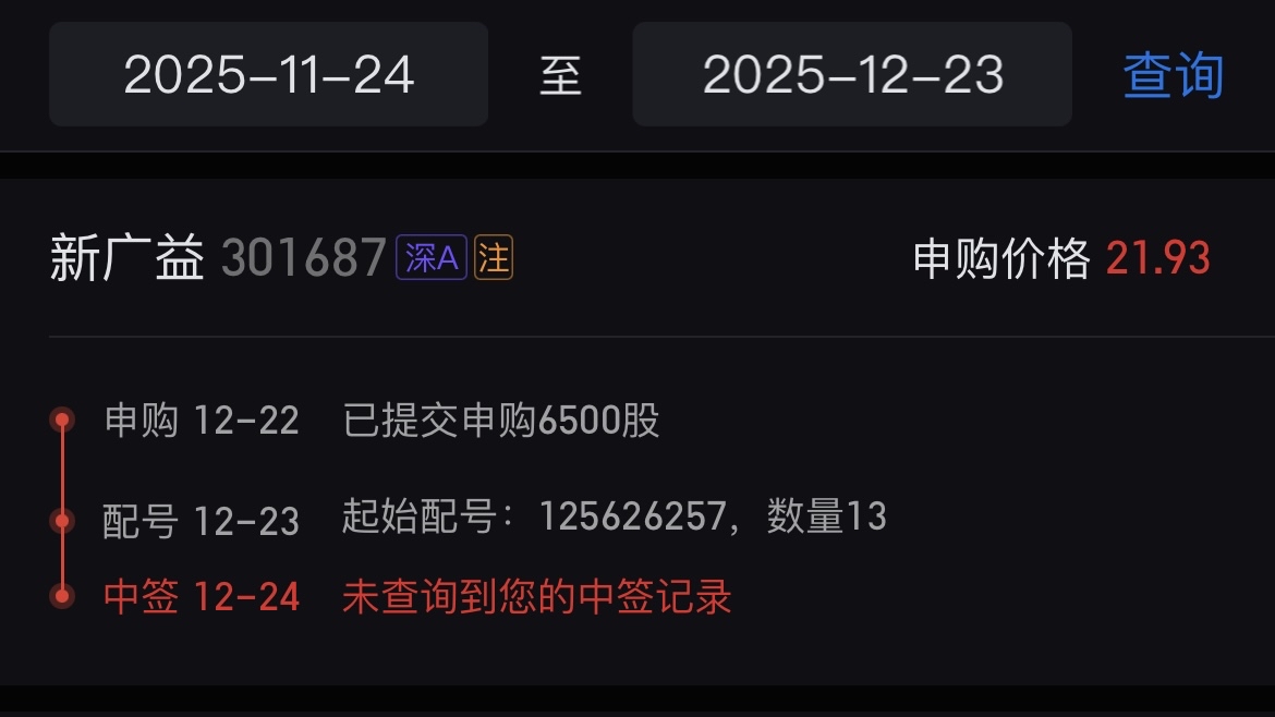 $新广益(SZ301687)$ 差四个号不给我