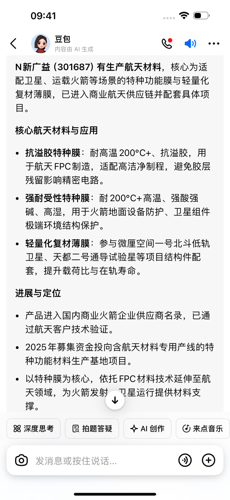 生产航天材料,核心为适配卫星、运载火箭等场景的特种功能膜与轻量化复材薄膜,已进入