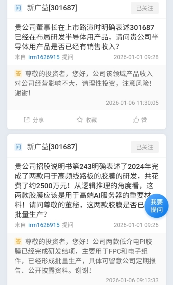 301687的低介电PI胶膜(可用于高端AI服务器)已经开始量产,半导体产品的收入对公司的经营目前影响不大(但未来可期)!这个信息来自一月六日301687在互动平台的答复!
