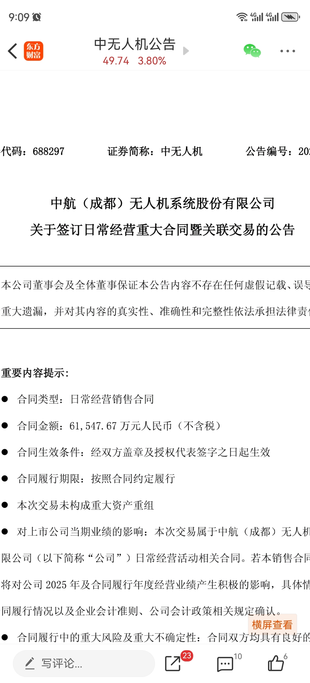 控股参股子公司成都中无人机公司签定重大合同。热烈祝贺所有长线持股投资者双节快乐!