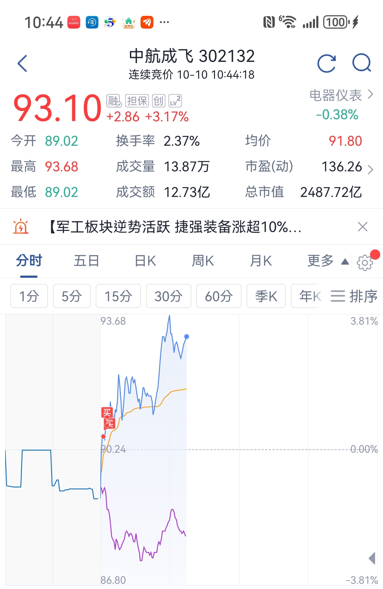 $中航成飞(SZ302132)$ 今早切入半仓9800股后悔入少了你继续升吧