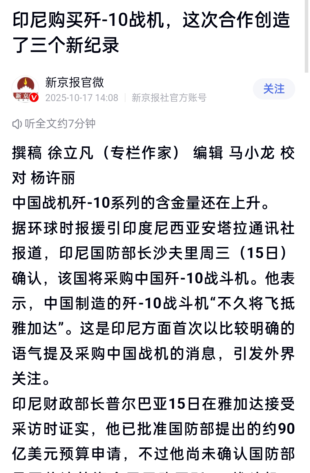 突发!10月19日新闻,印尼90亿美元订购42架歼10战机和配套设备