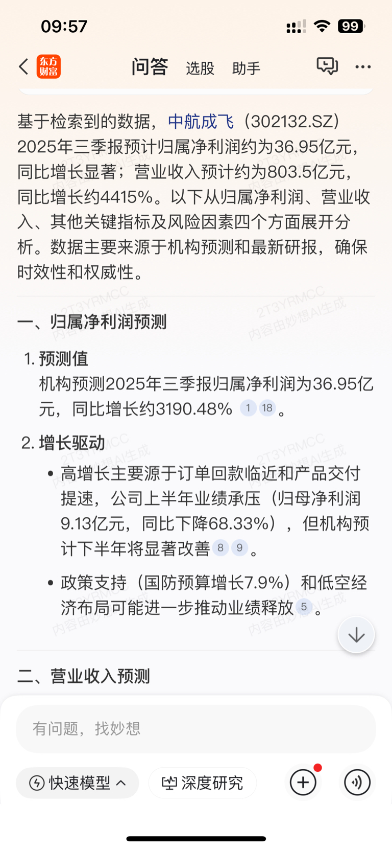 $中航成飞(SZ302132)$ 东财ai预计三季报增长三十多倍