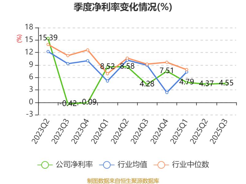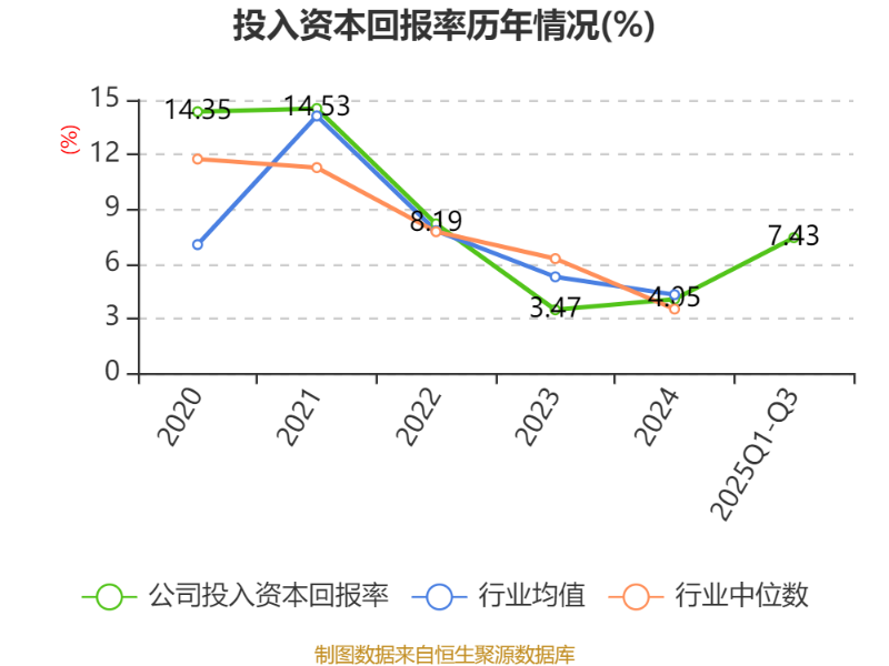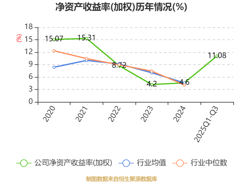 盈利能力方面, 2025年前三季度公司加权平均净资产收益率为11.08%,同比下降7.6个百分点。公司2025年前三季度投入资本回报率为7.43%,较上年同期上升3.84个百分点。