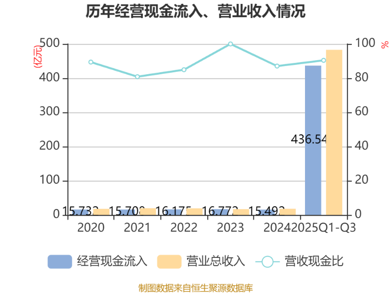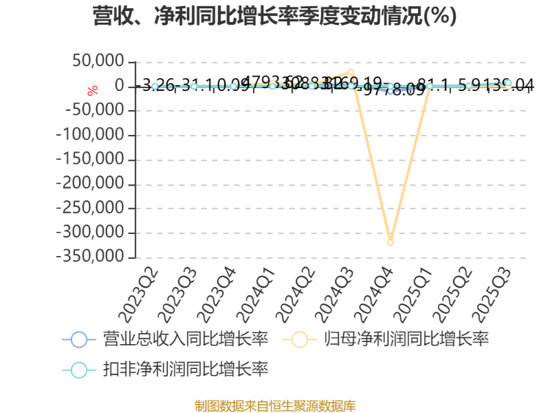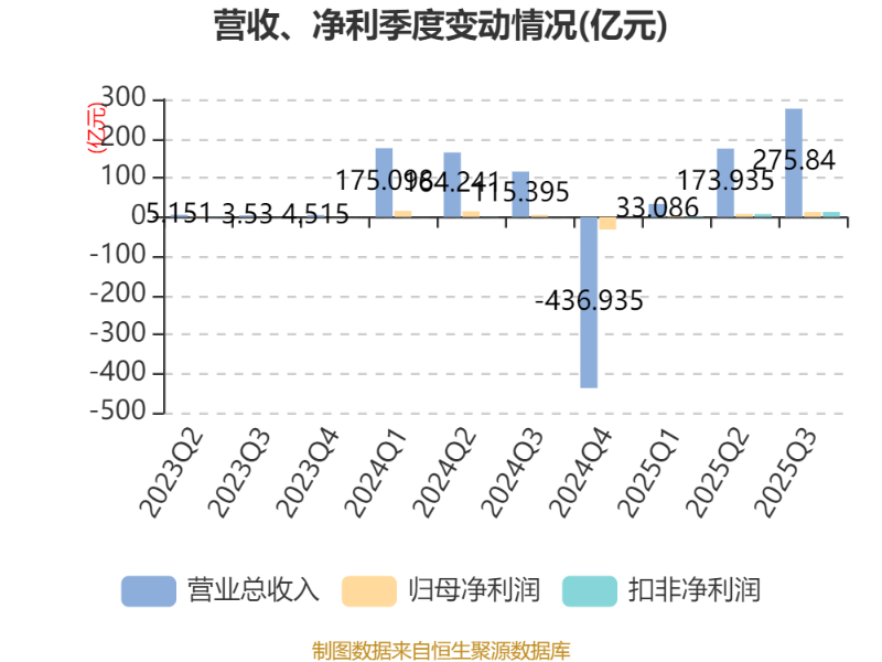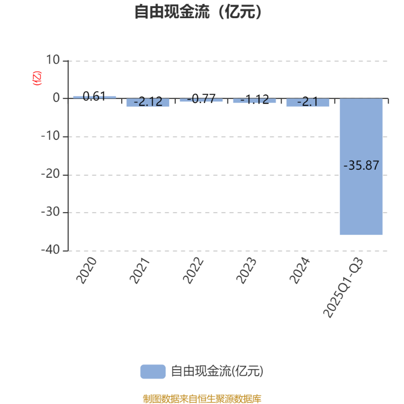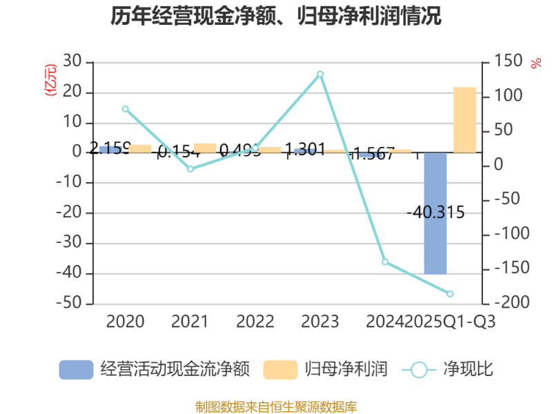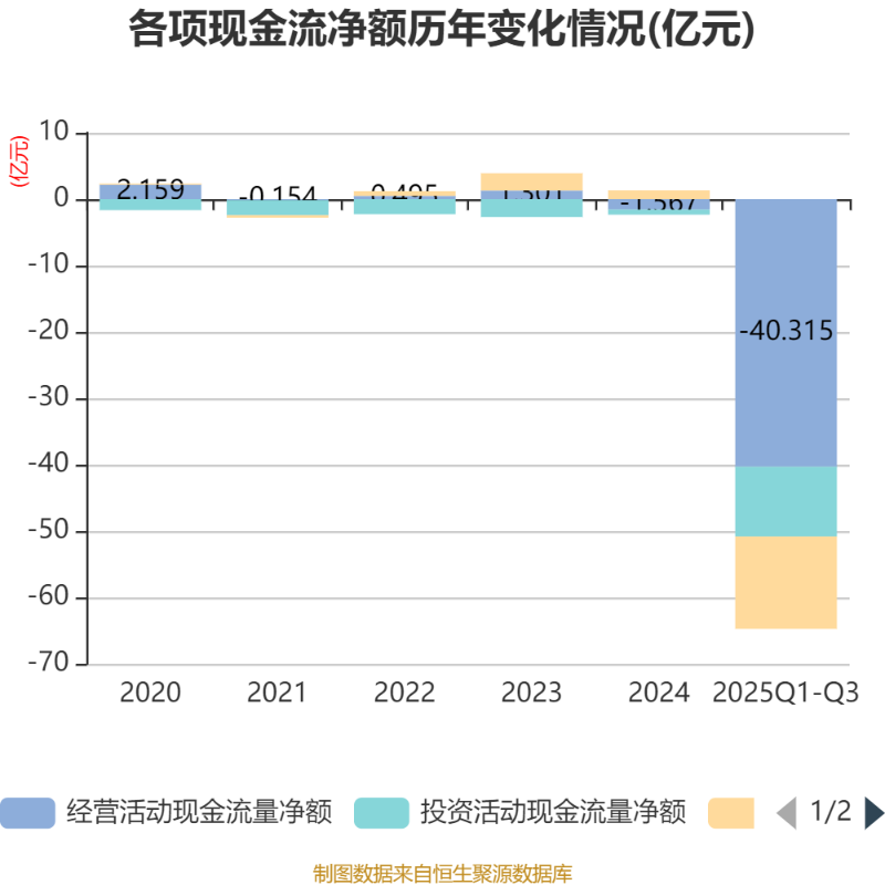 2025年前三季度,公司经营活动现金流净额为-40.32亿元,同比增加144.05亿元;筹资活动现金流净额-13.93亿元,同比减少19.38亿元;投资活动现金流净额-10.49亿元,上年同期为-8.68亿元。
