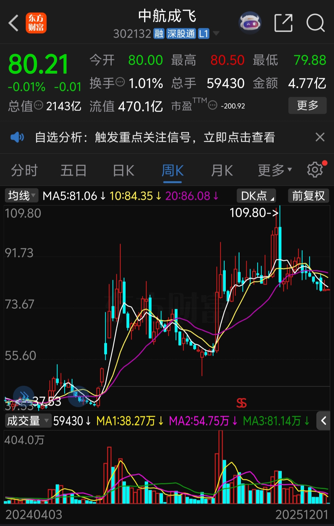 成飞80元股价处于高位回落的半山腰。今年两个因素把成飞炒高,一是5.7空战,二是