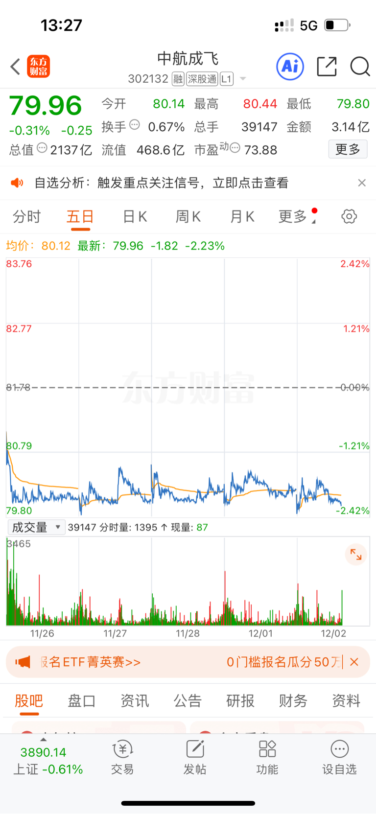 $中航成飞(SZ302132)$ 这五天走势,有点意思