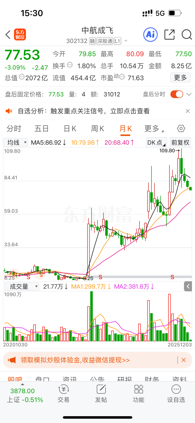 $中航成飞(SZ302132)$ 下跌空间不大,这是月线图