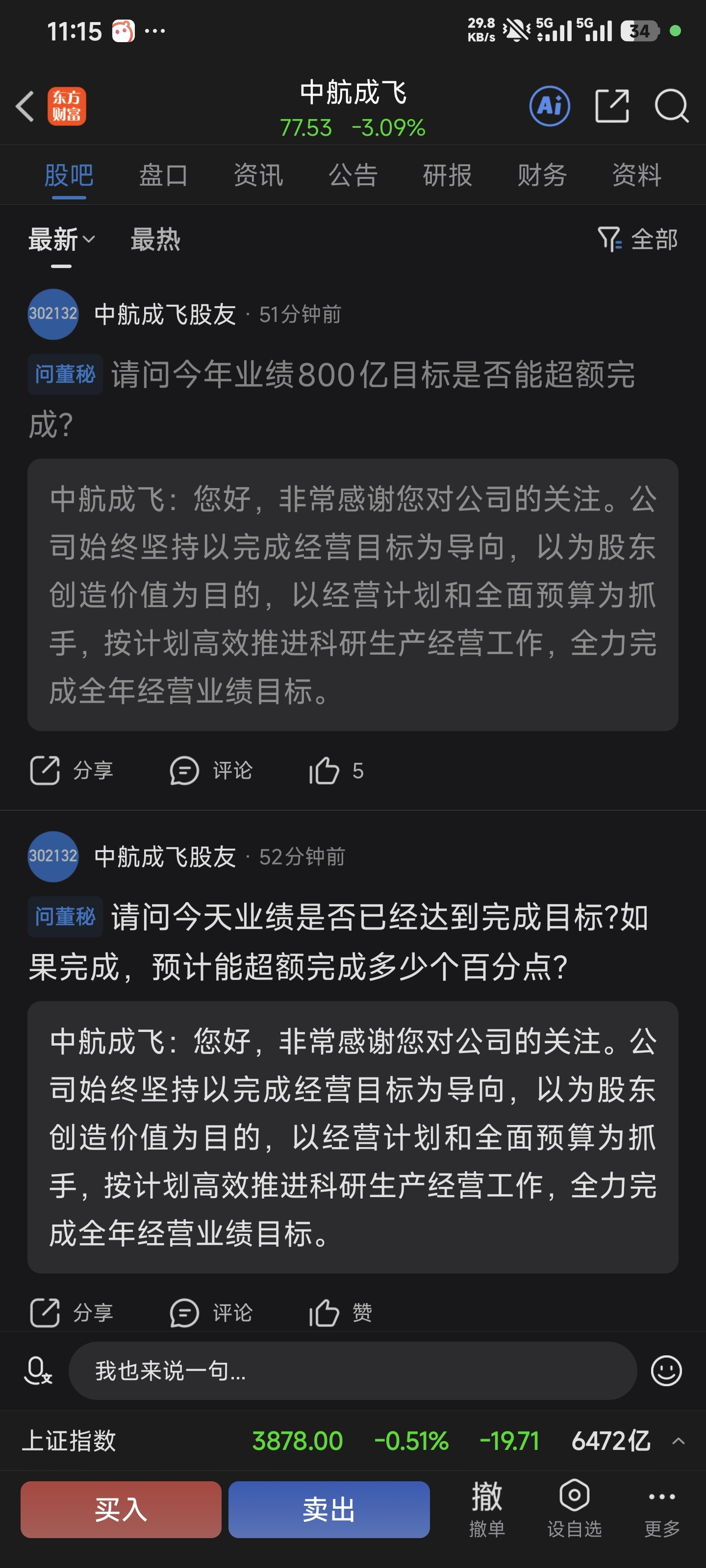 $中航成飞(SZ302132)$ 什么叫说了等于没说,问他吃了吗,他回答我从昨天就开始努力奋斗争取今天晚上完成目标。