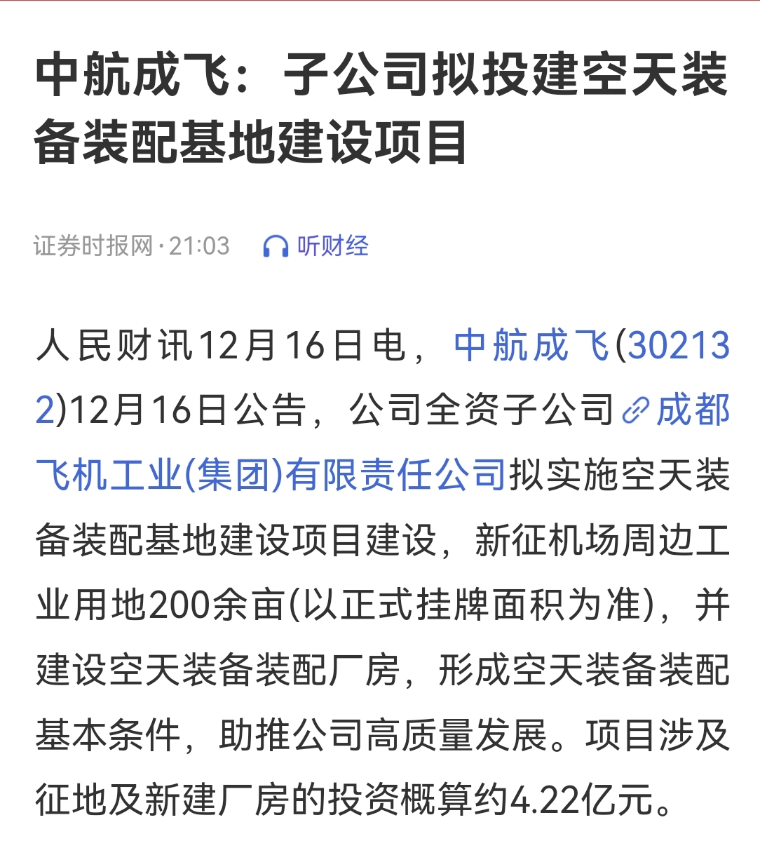 $中航成飞(SZ302132)$ 利好,明天20cm