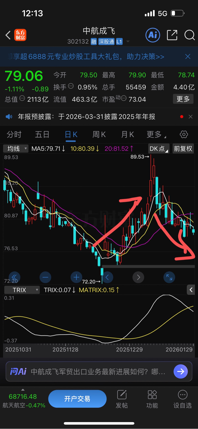 $中航成飞(SZ302132)$ 下跌不言底,与其博反弹,不如右侧交易,主力下午砸下来吧78.4止损。把筹码还给你。别耗了干脆点