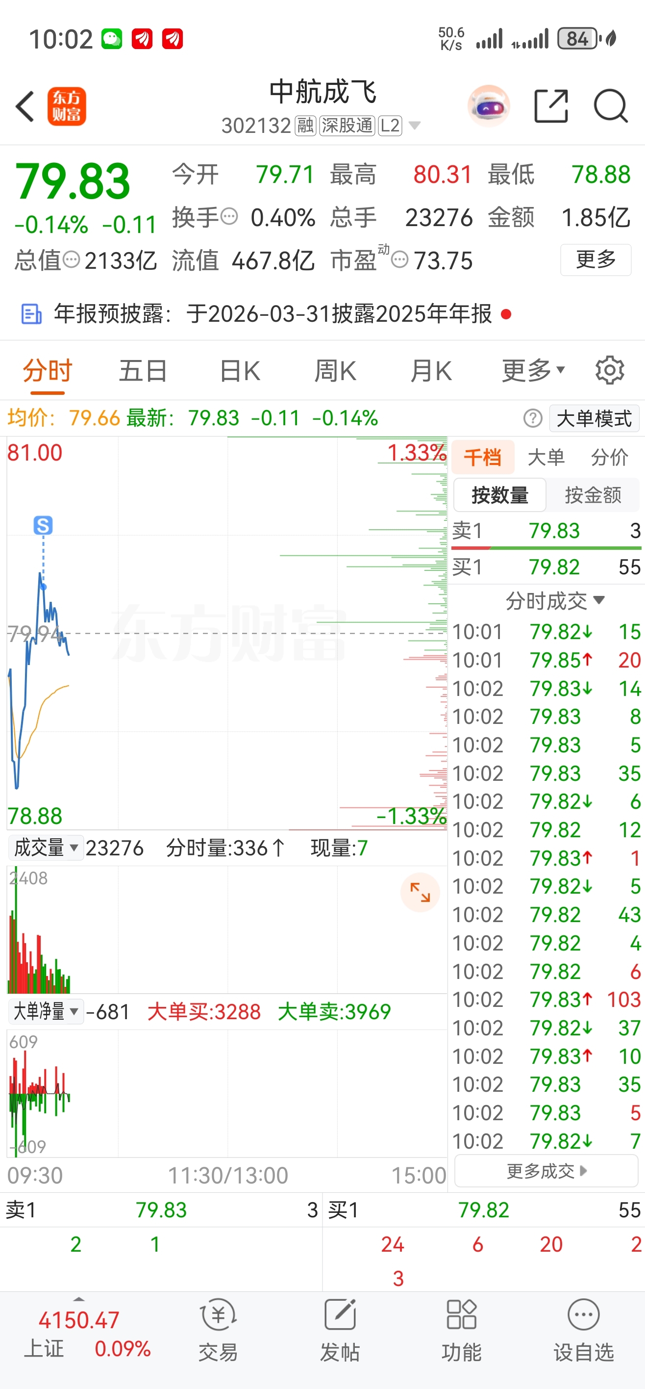 $中航成飞(SZ302132)$ 昨天79.93买的,没想到今天站不稳五日线就回调,很弱属于后排,卖掉删自选