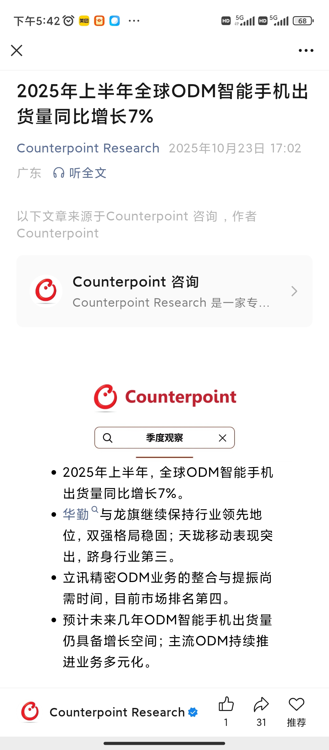 2025年上半年,全球ODM智能手机出货量同比增长7%。华勤与龙旗继续保持行业领