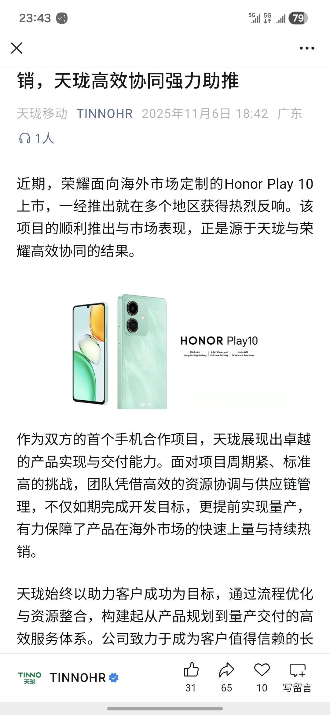 $天珑5(SZ400059)$ 终于生产了荣耀的手机