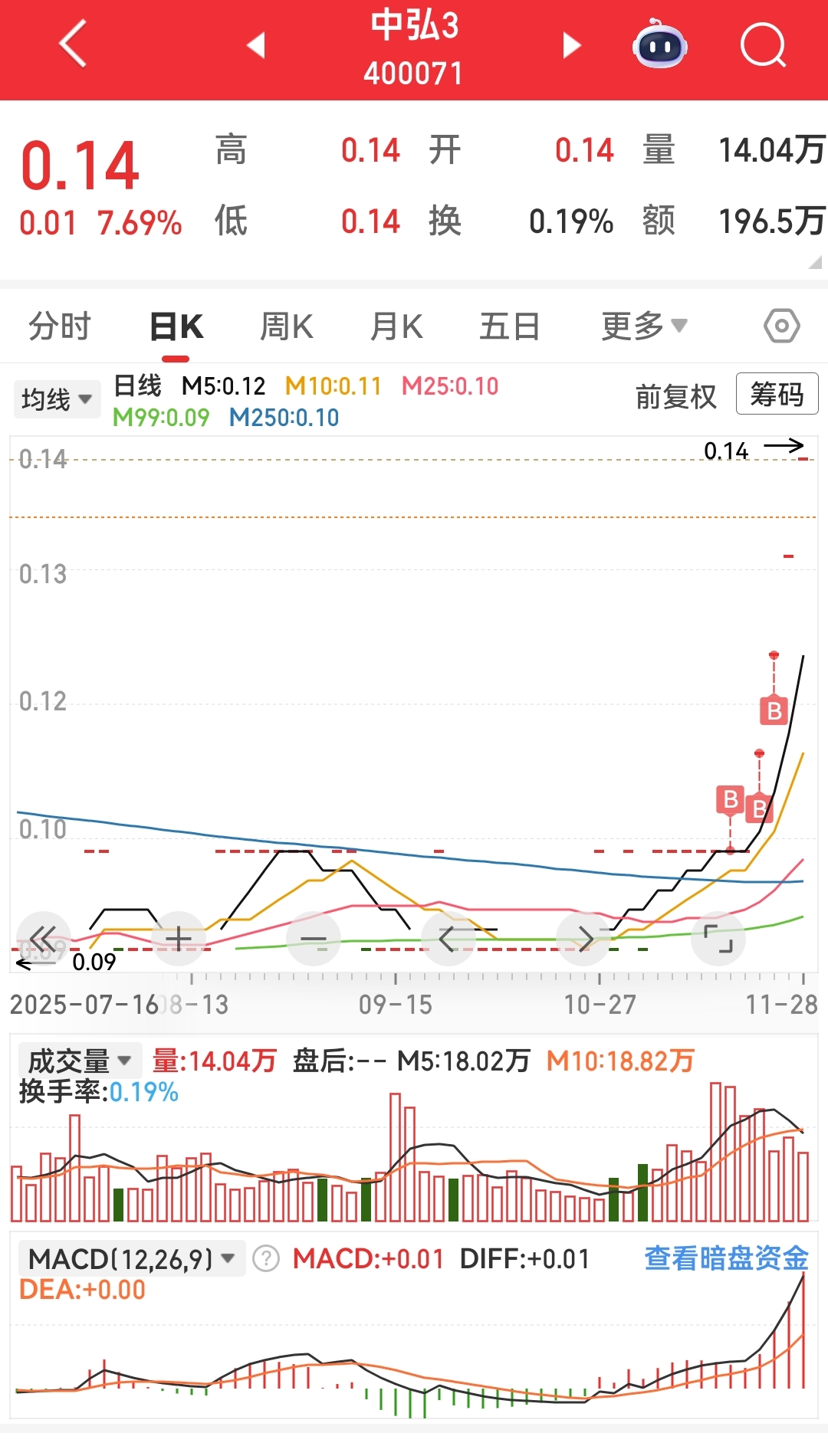 $中弘3(SZ400071)$ 中弘虽然身在三板,主力可是名门出身,技术流派走的中规中,量价协同绝不忽悠。日K线第一次突破年线,稍加整理,温和放量,MACD向上攻击发散。如此图形不果断加仓摊平成本,岂是我辈所为。危言耸听的恐吓,欲盖弥彰的对倒,摇摇欲坠的压盘,都是自欺欺人的戏码。我们不是吓大的,也不是泥捏的,我们是战士,更是勇于自我挑战的斗士