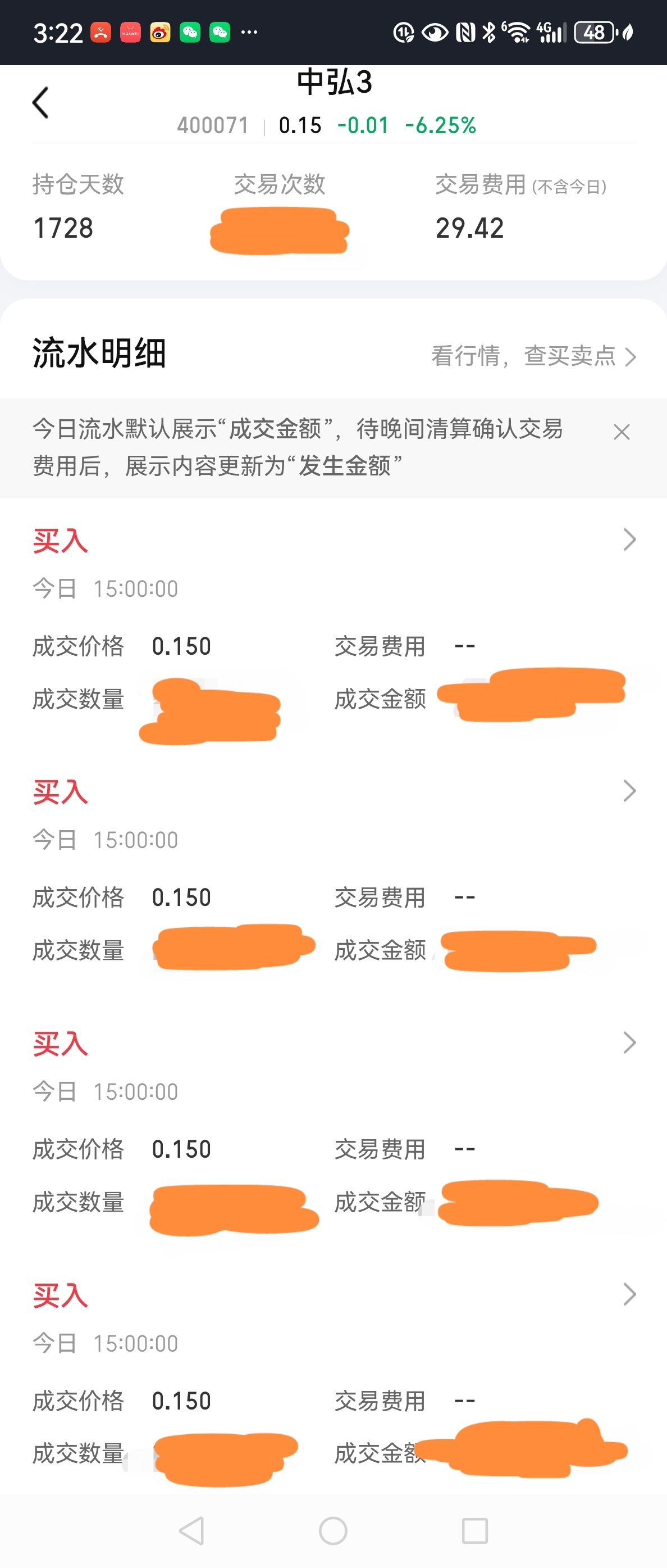 $中弘3(SZ400071)$ 今天挂了四个小单,继续买入。周五还有机会加仓,就是不知道成交在涨停还是跌停。今天是持有中弘第1728天