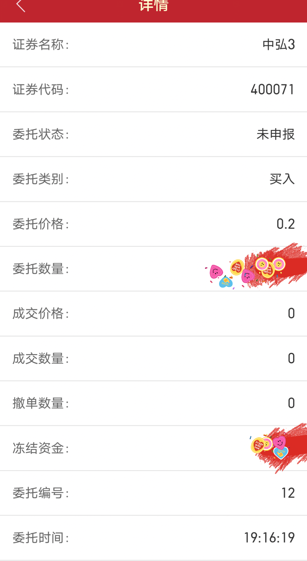 告诉大家一个好消息,周六的隔夜单排第12个,委托价0.2,有效,但未成交。