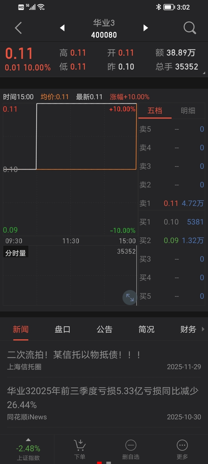 华业0.11压盘重重,买盘不足,周三回到0.1,拭目以待!