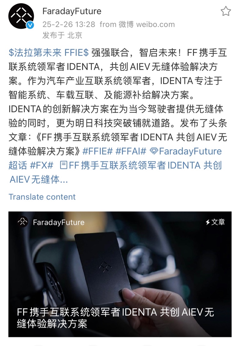 FF携手互联系统领军者IDENTA共创AIEV无缝体验解决方案。在FF,我们深信