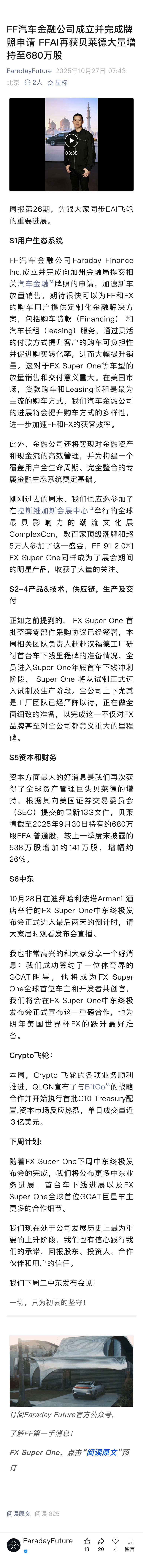 FF汽车金融公司成立并完成牌照申请 ,FFAI再获贝莱德大量增持至680万股,FX Super One明天举行中东终极发布会