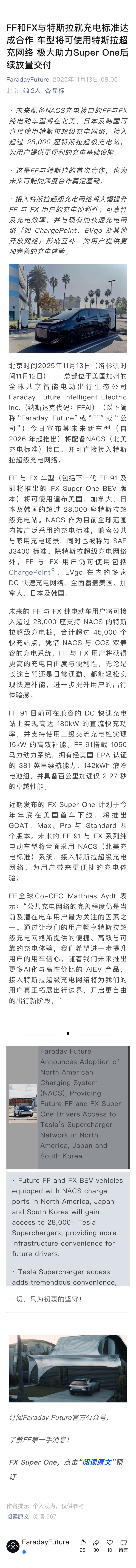 FF和FX与特斯拉就充电标准达成合作 车型将可使用特斯拉超充网络 极大助力Super One后续放量交付