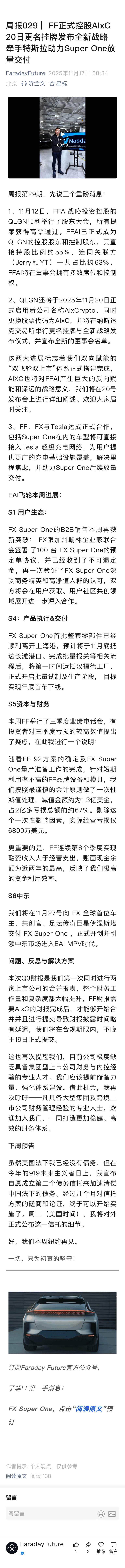 周报029 | FF正式控股AIxC 20日更名挂牌发布全新战略 牵手特斯拉助力Super One放量交付