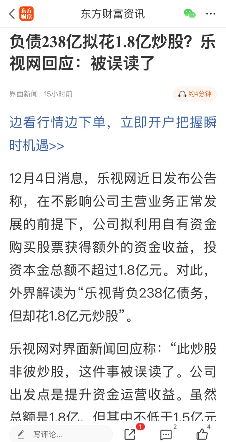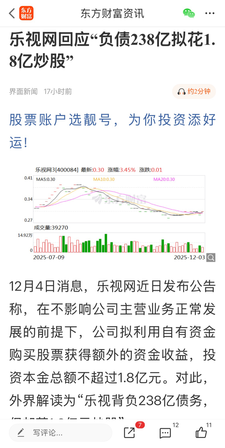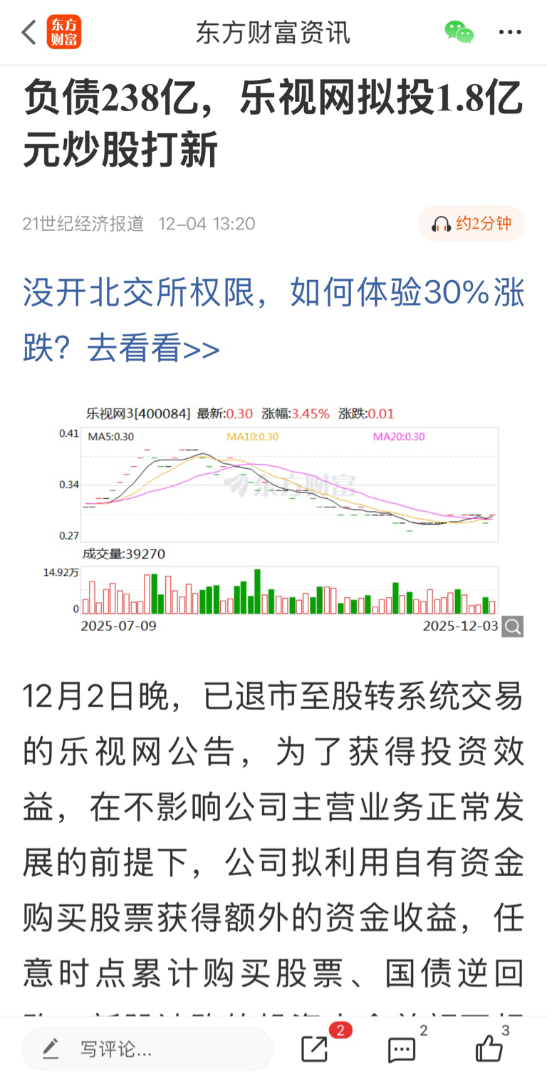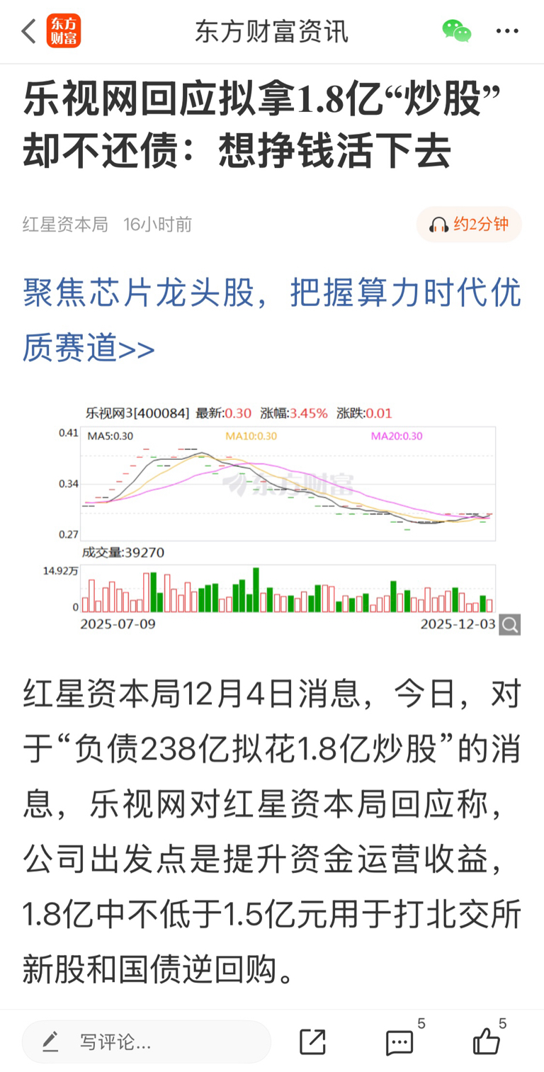 乐视网近期公告,拟用不超1.8亿元开展金融投资,含北交所打新、二级市场股票买卖及国债逆回购。其中,北交所打新与国债逆回购占比不低于1.5亿元。比起还债,活着最重要。留得青山在,不怕没柴烧!不是吗?