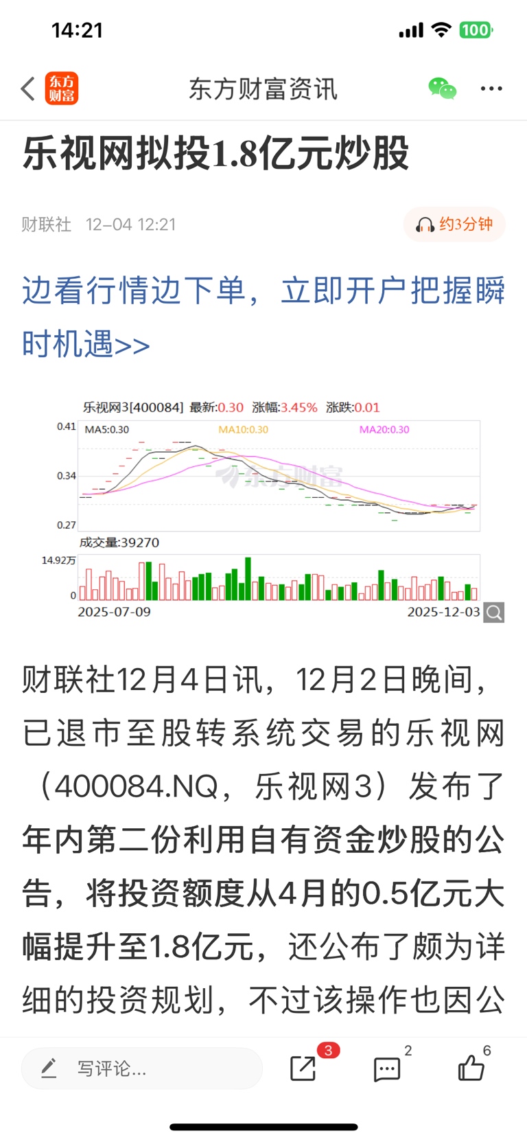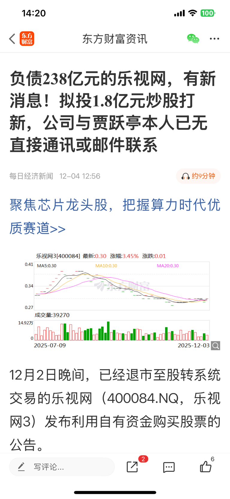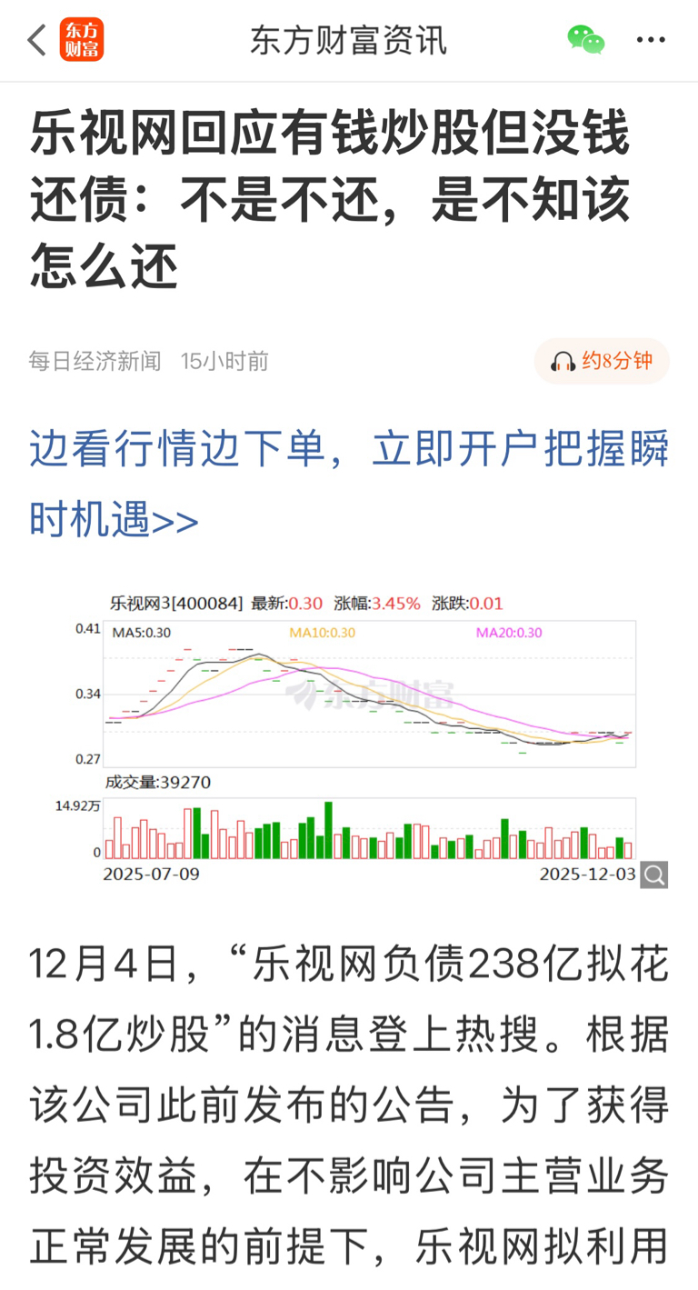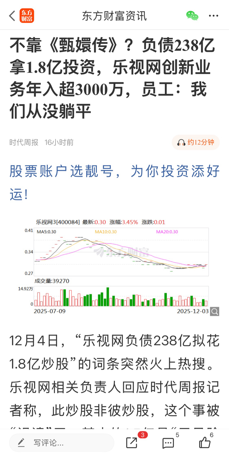 乐视网近期公告,拟用不超1.8亿元开展金融投资,含北交所打新、二级市场股票买卖及国债逆回购。其中,北交所打新与国债逆回购占比不低于1.5亿元。比起还债,活着最重要。留得青山在,不怕没柴烧!不是吗?