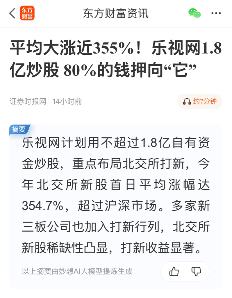 乐视网近期公告,拟用不超1.8亿元开展金融投资,含北交所打新、二级市场股票买卖及