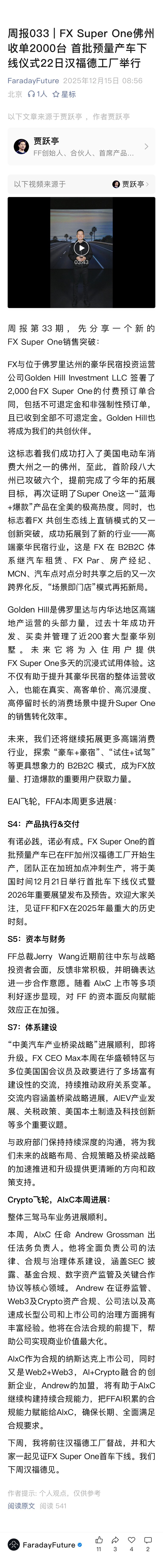 周报033 | FX Super One佛州收单2000台 首批预量产车下线仪式22日汉福德工厂举行
