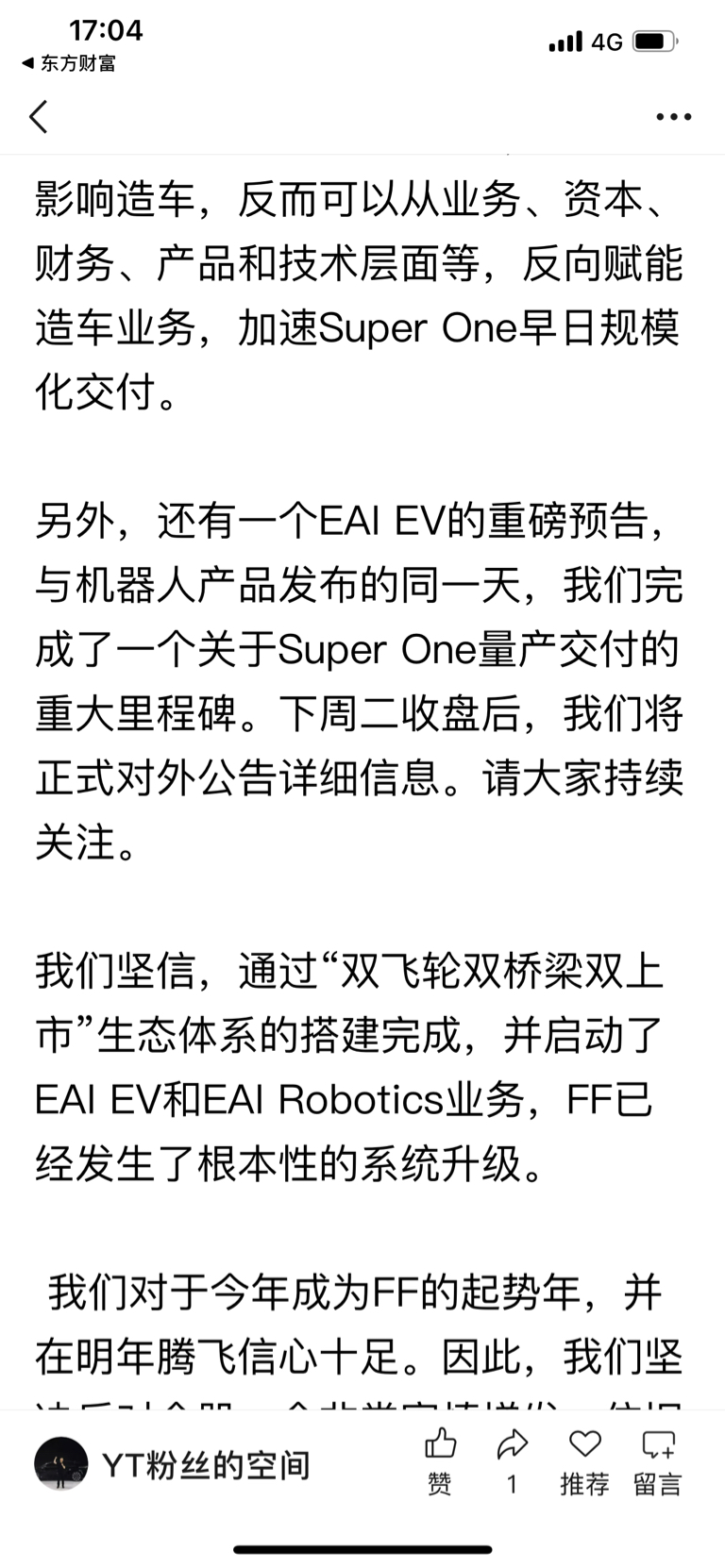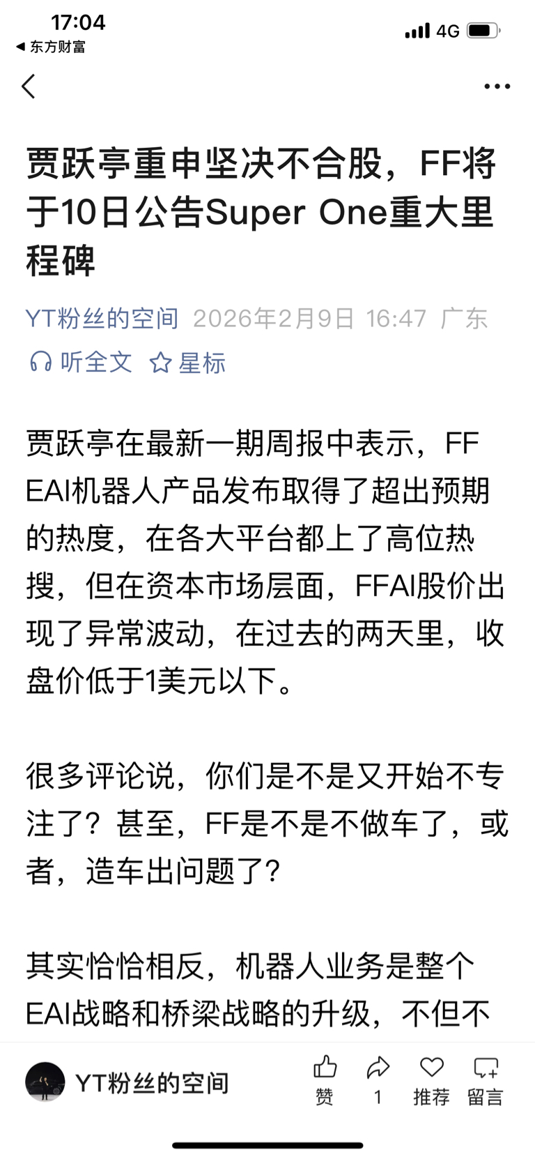 贾跃亭重申坚决不合股,FF将于10日公告Super One重大里程碑