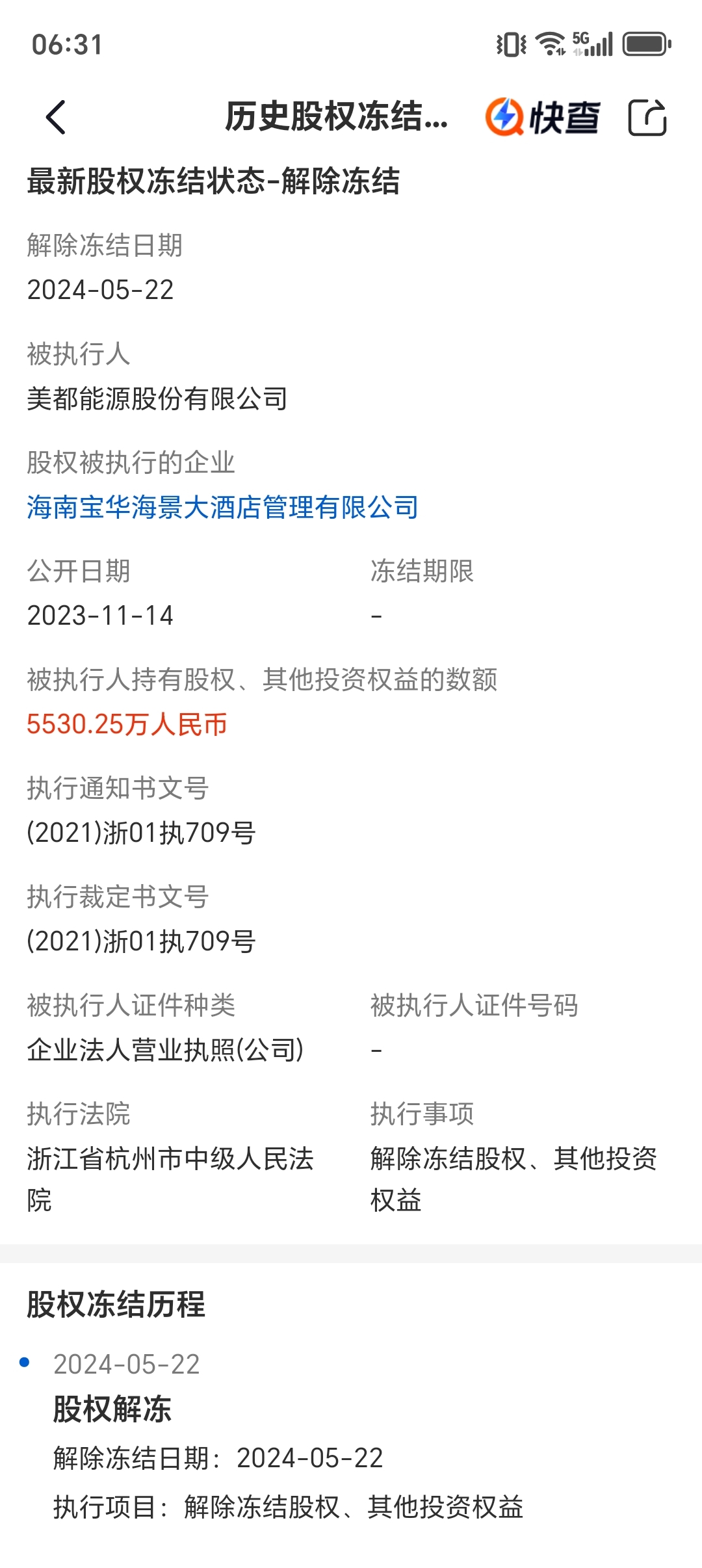 $美都5(SZ400088)$ 海南宝华海景大酒店的的股权还在,也解冻了。