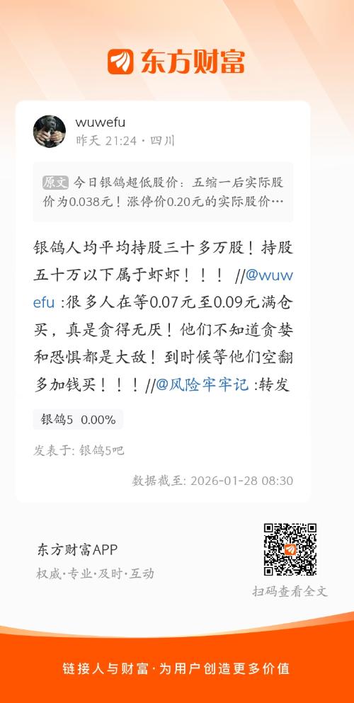 特别提示://@wuwefu :银鸽人均平均持股三十多万股!持股五十万以下属于虾虾!!!//@wuwefu :很多人在等0.07元至0.09元满仓买,真是贪得无厌!他们不知道贪婪和恐惧都是大敌!到时候等他们空翻多加钱买!!!//@风险牢牢记 :转发